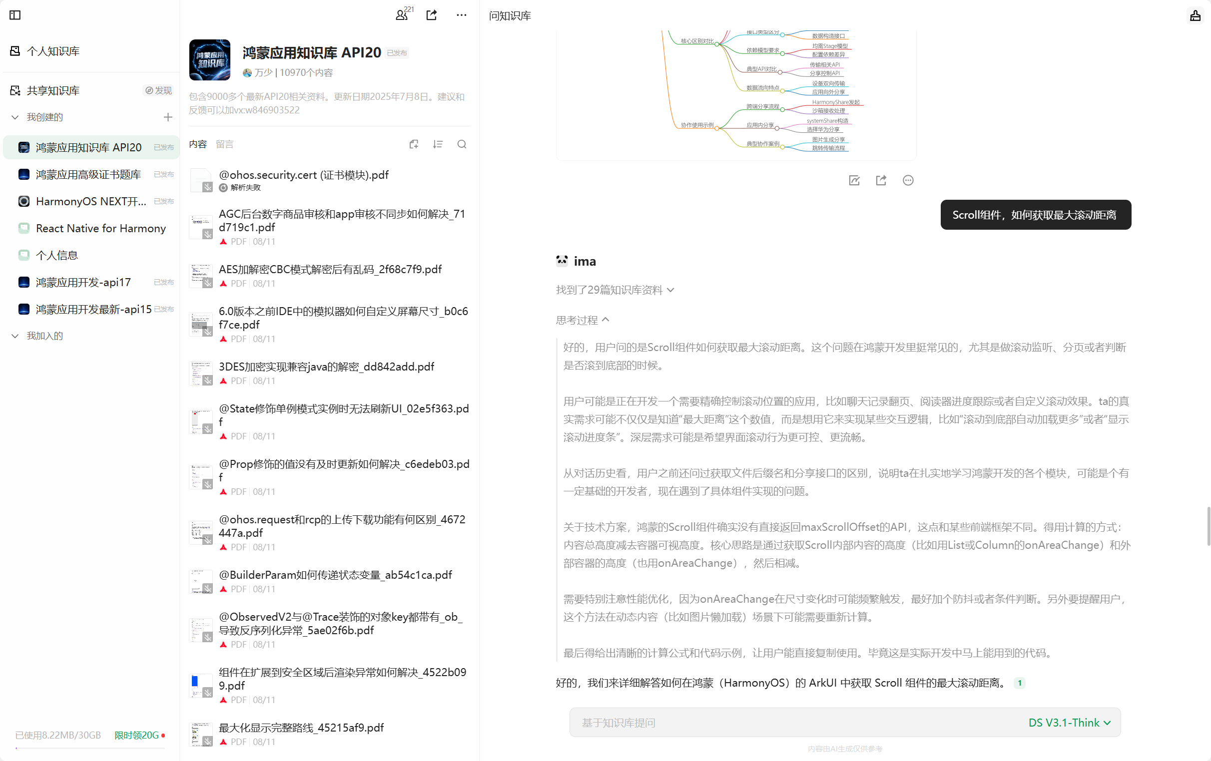 关键在于使用另一个AI工具——ima 鸿蒙应用开发知识库。这是我基于鸿蒙应用API20搭建的知识库,你可以通过自然语言查询获取信息。由于我提前导入了鸿蒙官网1万多个API20文档,它给出的答案相对准确,我最终就是基于它提供的代码完成了需求。