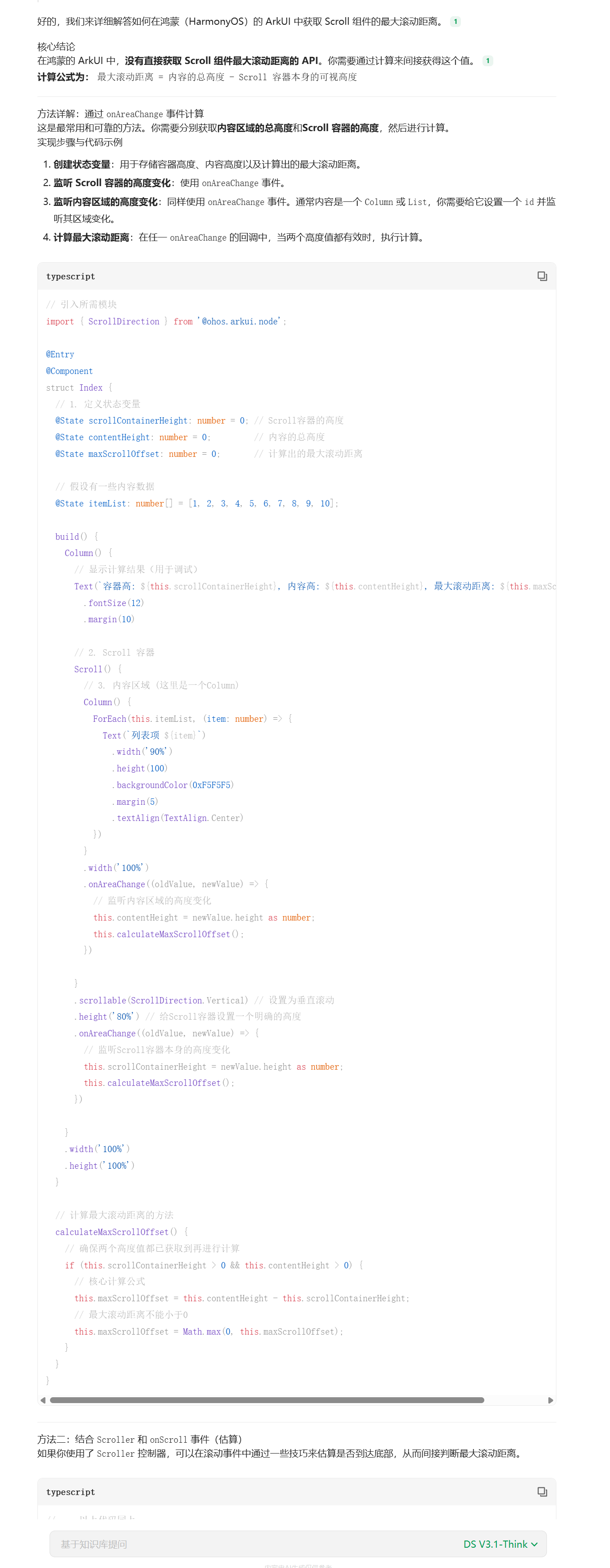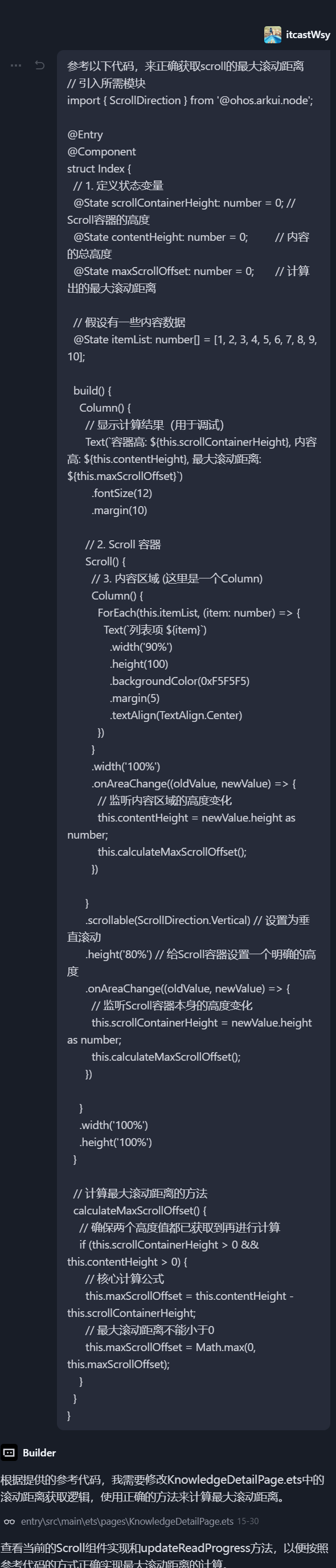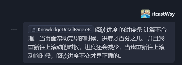 阅读进度的百分比 = 当前页面滚动的距离 / 页面可以滚动最大的距离这部分代码在HarmonyOS中,结合AI工具实现的话, AI编辑工具死活不知道如何获取页面最大的距离,这个也怪它,要知道鸿蒙开发官网的文档都不是服务器渲染的,也就是你直接给ai一个网址,它是无法直接读出里面具体的代码的。